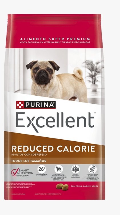 *Contiene 12% menos calorías que el alimento PURINA® EXCELLENT® Adulto Razas Medianas y Grandes. Contiene 14% menos calorías que el alimento PURINA® EXCELLENT® Adulto Razas Pequeñas.