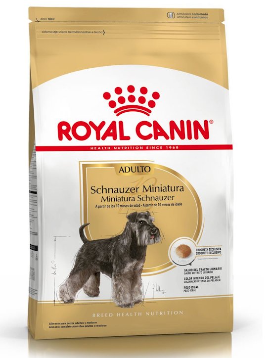 Contiene una exclusiva croqueta desarrollada para adaptarse perfectamente a la mandíbula del perro adulto de esta raza. Su fórmula posee una combinación de nutrientes y EPA/DHA que ayuda a promover una piel saludable, e incluye aminoácidos específicos para ayudar a mantener el color natural del pelaje. Además, ayuda a mantener el peso ideal del Schnauzer Miniatura.