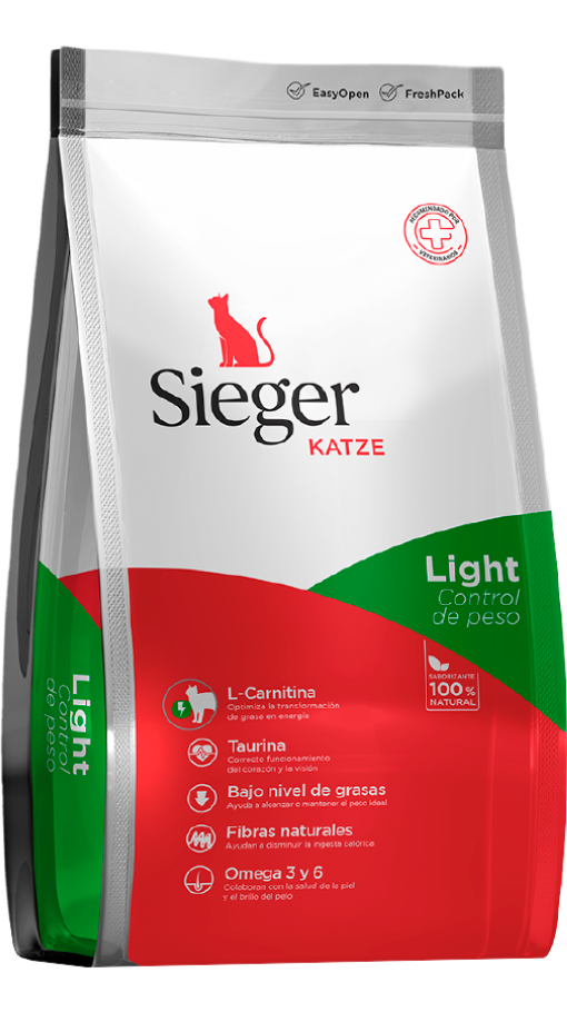 Sieger Katze Light alimento específico para gatos poco activos o con tendencia al sobrepeso, está especialmente formulado con la cantidad óptima de proteínas, grasas y fibras para que el gato incorpore todos los nutrientes esenciales durante la etapa de restricción calórica.
