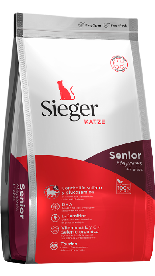 Sieger Katze Senior posee una fórmula ideada exclusivamente para esta etapa. Por su aporte de Condroitín Sulfato y Glucosamina, que colaboran en la protección de las articulaciones, y gracias al DHA, que estimula la actividad cerebral, retrasa el proceso de envejecimiento, manteniéndolos vitales.