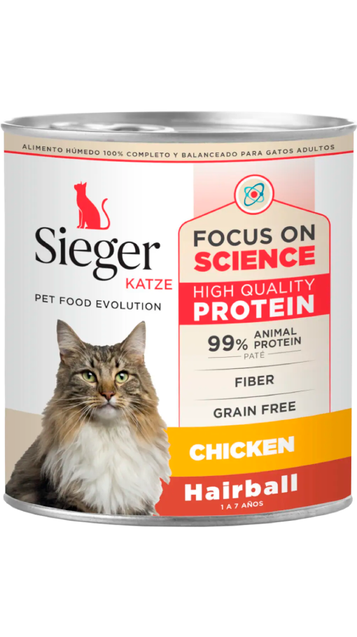 Sieger Katze Wet Adult Hairball es un alimento balanceado húmedo completo para gatos adultos de un año, formulado con una concentración de nutrientes específicos, sumamente digestibles que ayudan a eliminar las bolas de pelo debido al alto contenido de fibra.