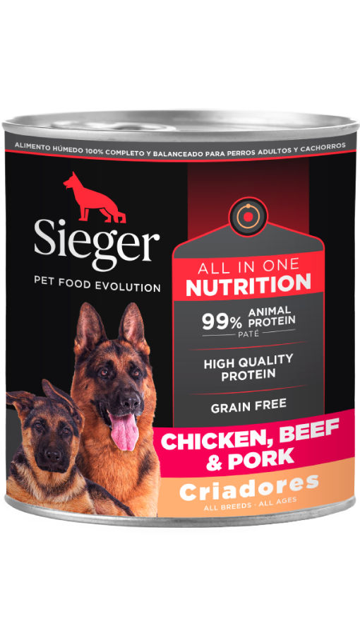 Sieger Wet Criadores All in One es un mix de carne de vaca, cerdo y pollo. Lo que aporta un mejor perfil de aminoácidos. Sin cereales, con un 99% de proteína animal, todas las vitaminas y minerales, glucosamina y condroitín sulfato para fortalecer las articulaciones y huesos. La inclusión de taurina contribuye con el correcto funcionamiento del músculo cardíaco. Sieger Criadores Wet se puede agregar al alimento Sieger Criadores Seco, para sumar aún más beneficios funcionales y realzar el sabor o darlo sólo como una nutritiva y deliciosa comida, dado que es un alimento húmedo 100% completo y balanceado para perros de todos los tamaños y edades.