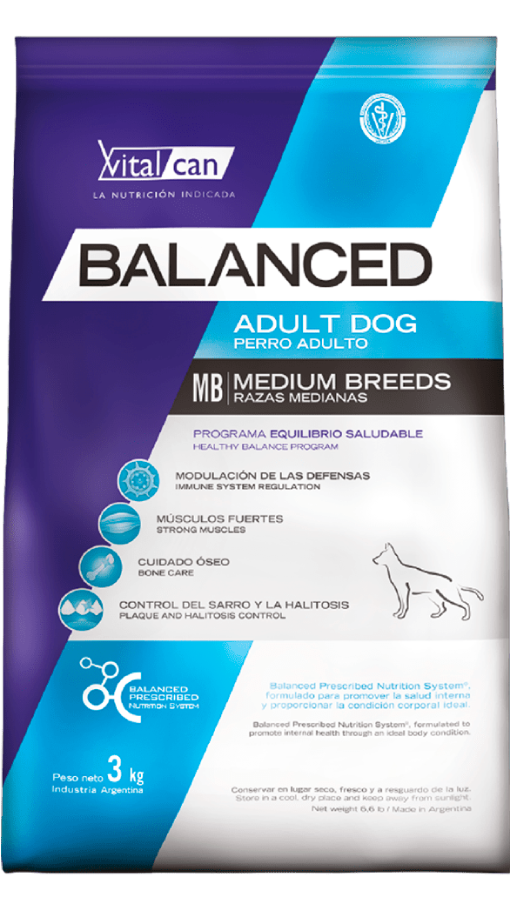 Vitalcan Balanced es ideal para perros adultos de raza mediana porque su Programa Equilibrio Saludable les proporciona:
