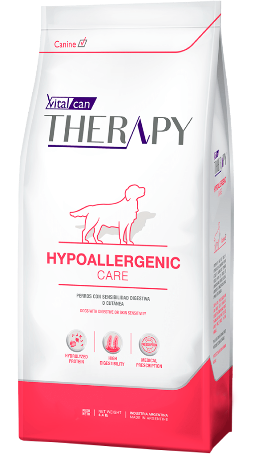 - Vitalcan Therapy Canine Hypoallergenic Care será prescripto por el Médico Veterinario en casos como alergia e intolerancia alimentaria con manifestaciones digestivas y/o cutáneas, enfermedad inflamatoria intestinal (EII), etc. y puede ser utilizado como dieta para descartar la sensibilidad a ciertas proteínas.